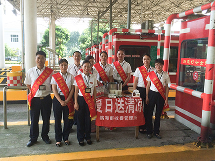 圖為工作人員合影 活動當天,該所在車道安全島內搭起臨時“便民服務臺”,不僅免費為司乘人員提供綠豆湯、礦泉水等消暑食品,還備足藿香正氣水、風油精、清涼油、花露水等解暑降溫藥品。活動中,大家身披橫幅,面帶微笑,向途經收費所的司機遞上一杯杯綠豆湯、一瓶瓶礦泉水。同時,大家還不忘宣傳行車安全注意事項,提醒司機朋友在高溫酷暑時節多注意安全。司機朋友們不時露出欣喜的笑容,連連稱謝。 臨海南收費所通過開展“夏日送清涼”活動,不僅給廣大司乘人員在酷暑中送去絲絲涼意和關心,更加促進了收費員與司乘人員之間的溝通交流,拉近距離,從而贏得了過往司乘人員的好評,塑造了良好的窗口形象。 陳瑩