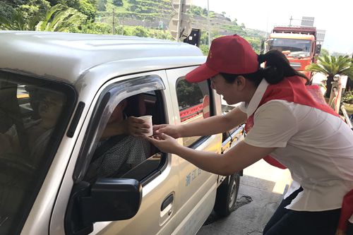 天氣雖炎熱,服務(wù)不“打烊”。 在活動(dòng)中,志愿者們不顧自身大汗淋漓,仍身披橫幅,頭戴小紅帽,面帶微笑向途經(jīng)收費(fèi)所的司機(jī)們遞上一杯杯綠豆湯、一瓶瓶礦泉水。同時(shí),大家還不忘宣傳行車安全注意事項(xiàng),提醒司機(jī)朋友在高溫酷暑時(shí)節(jié)多注意行車安全。