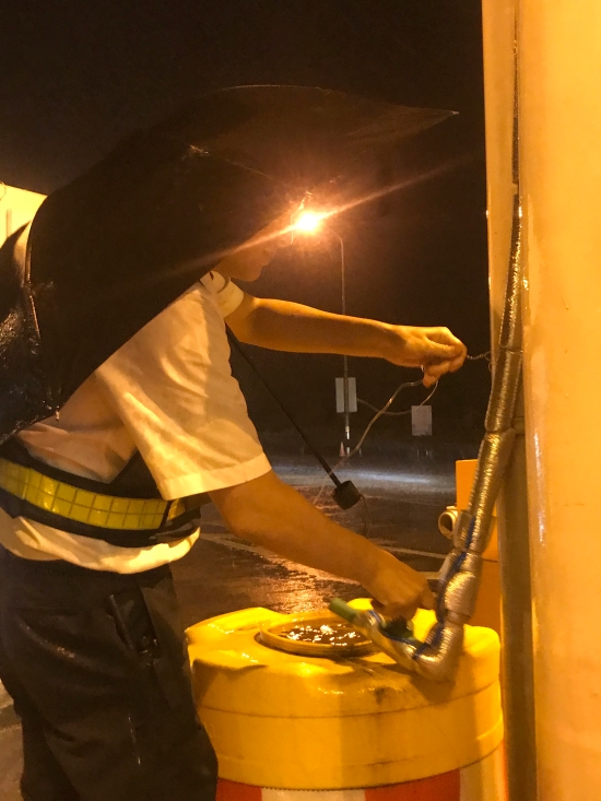 8月9日21點22分,風(fēng)雨越來越大,臨海南收費所車道水管被狂風(fēng)吹得隨意搖晃,當班收費員李俊杰不顧狂風(fēng)暴雨,第一時間拿上鐵絲冒雨捆綁,防止砸到過往車輛,保證了車道安全暢通。