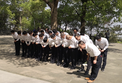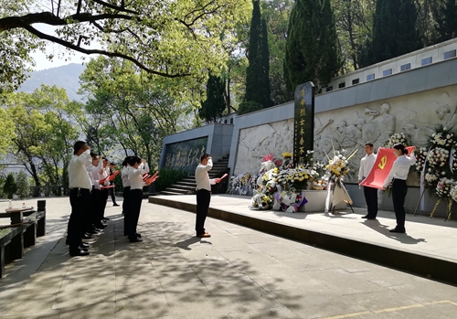 圖為敬獻(xiàn)鮮花 九峰烈士陵園始建于1956年,埋葬著20世紀(jì)50年代為國(guó)捐軀的120余位革命先烈。墓區(qū)內(nèi)青松翠柏環(huán)繞,墓前豎有一座“革命烈士永垂不朽”的石碑。上午10時(shí)許,祭掃儀式開始,全體人員懷著無比崇敬的心情向革命先烈鞠躬默哀,緊接著依次走到紀(jì)念碑前敬獻(xiàn)鮮花,表達(dá)對(duì)革命先驅(qū)的悼念與緬懷之情。在紀(jì)念碑前,全體黨員重溫入黨誓詞“我志愿加入中國(guó)共產(chǎn)黨,擁護(hù)黨的綱領(lǐng),遵守黨的章程......”