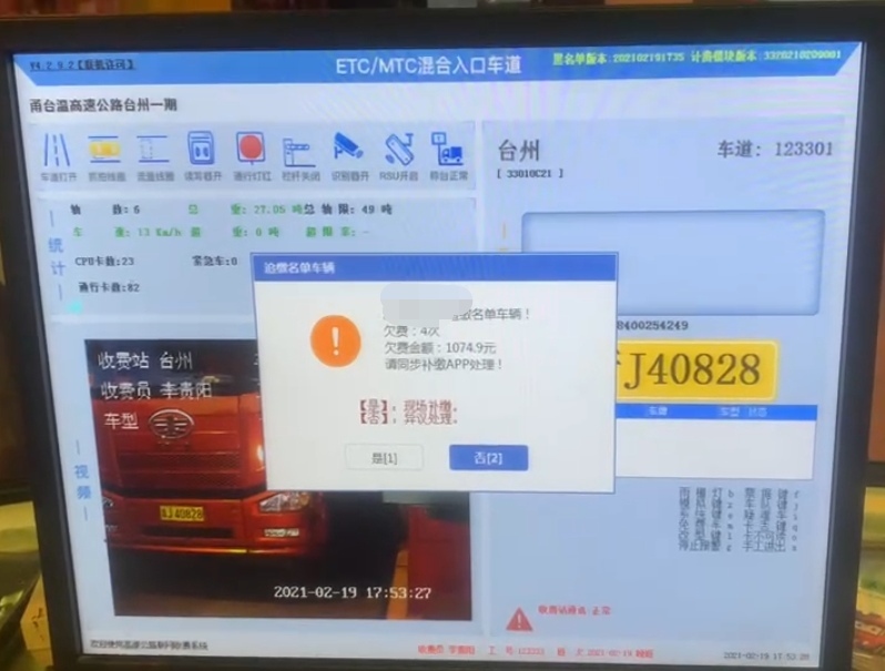 自取消省界收費站全國高速公路聯網后,跨省追繳通行費一直是個大難題,不少司機的省外通行費因無法追繳,造成通行費不斷流失。交通部為了適應“全國一張網”稽核業務工作需要,確保各收費站現場有序處理追繳名單車輛,避免造成社會輿情和人身財產安全事件,研發了全國稽核通行費補費系統。 2月19日晚17點50分左右,臺州收費所進口迎來一輛車牌為浙J開頭的六類貨車,車道屏幕顯示為“浙J XXXXXX追繳名單車輛,欠費4次,欠費金額1074.9元,請同步補繳APP處理。”當班收費員見此詢問駕駛員是否欠費,并喊來當班班長張錚過來處理。