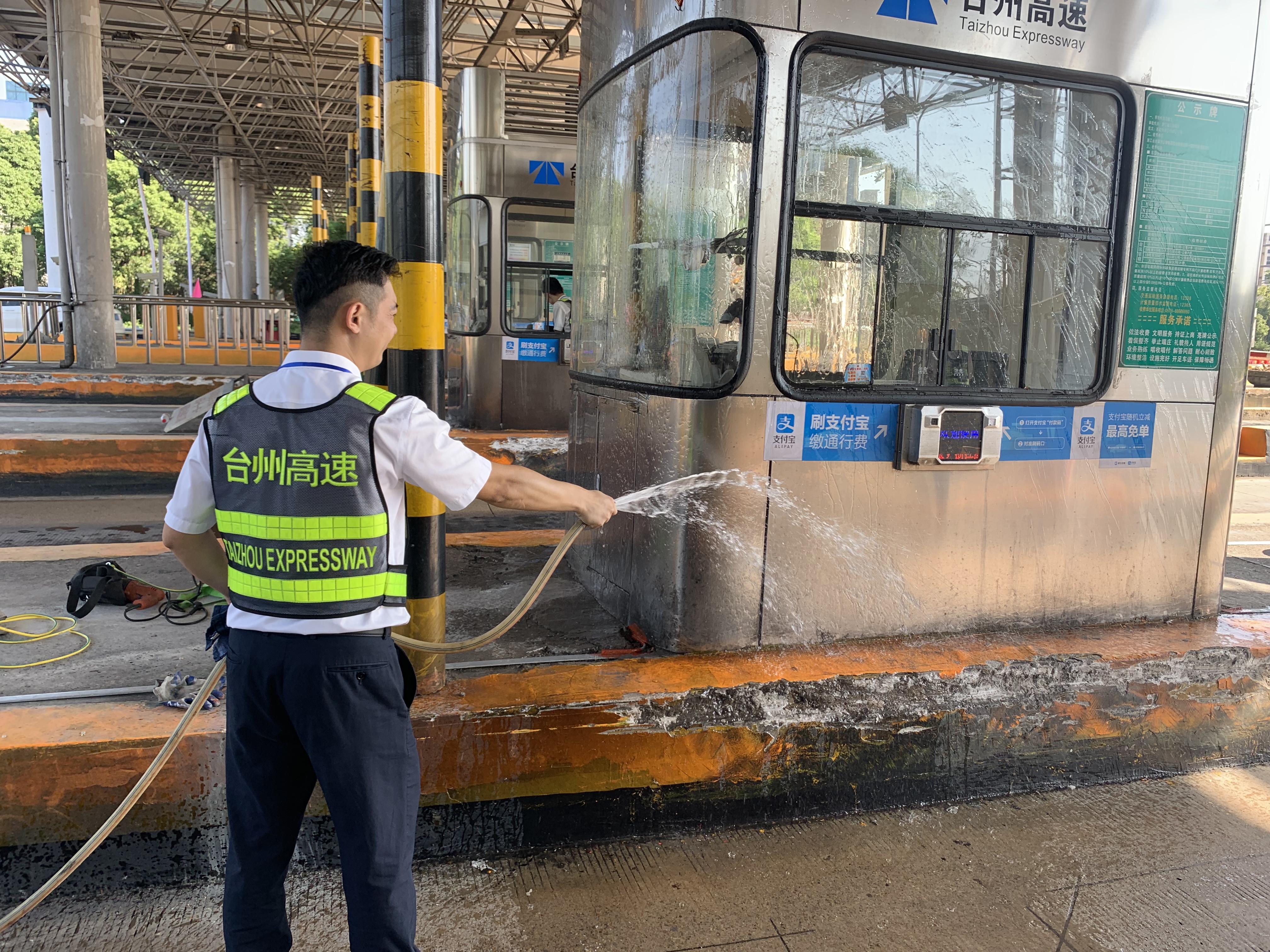 圖為工作人員打掃車道衛生 此次環境衛生大掃除本著徹底清理、不留死角的原則,以班組為單位,細分責任區,明確保潔要求,限時清理,全所員工充分發揚不怕苦、不怕累的精神,重點對收費站內外廣場、車道、崗亭、島頭、邊溝、標志標牌等區域及設施設備進行了一次深度清潔。