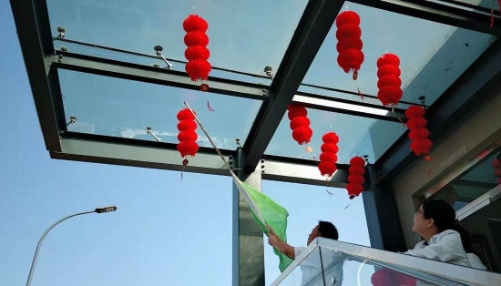 圖為工作人員一起布置收費所 在慶祝祖國70周年生日的日子里,最火的顏色就是紅色。為了弘揚中華民族傳統文化,溫嶺西收費所后勤組早早購置了燈籠、彩旗、五星紅旗,寫好“慶祝祖國70周年華誕”大字等。黨員帶頭,團員緊跟,一線收費員紛紛參與,在收費站大門口、辦公樓、食堂、宿舍等區域精心用五星紅旗、大紅燈籠、五顏六色的彩旗裝點,一抹抹艷麗的國旗紅,成為站點最靚麗的風景。明亮的黃、鮮艷的紅,美麗窗口突然亮了起來,到處洋溢著濃濃的國慶氛圍,為過往司乘提供暢、潔、美的節日行車環境。 溫嶺西收費所后勤組還精心策劃、精細編排,制作了具有特色、獨具創意的生日祝福“小視頻”,祝祖國生日快樂! 通過開展弘揚愛國精神,喜迎國慶活動,溫嶺西收費所全所工作人員更加不忘初心,砥礪前行,共同慶祝祖國70周年華誕。 鄭霞霞