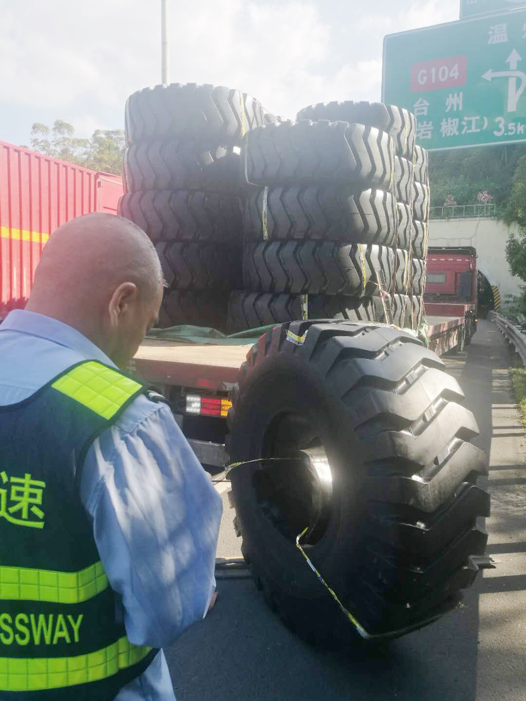 執(zhí)勤隊接警后立即趕往事故地點,一輛運載輪胎的貨車??吭谥鬈嚨?,其中一個巨型輪胎滑落到硬路肩上,致使后方車輛紛紛避讓。為及時消除險情,執(zhí)勤隊快速在現(xiàn)場做好安全警戒工作,同時將現(xiàn)場情況反饋給監(jiān)控中心。由于貨車綁繩索松動,重達300多斤的輪胎脫落在地,隨后執(zhí)勤隊協(xié)同施救中心、駕駛人員合力將掉落的輪胎先拖至車旁,經(jīng)過長達半個小時的搶險,跌落的貨物終于完好無缺地回到貨車上,道路恢復暢通。 筆者溫馨提醒:在高速公路行駛過程中,駕駛人應注意將車上的貨物固定好,途中要隨時注意貨物及捆綁繩索是否松動。無論是車輛撒落物還是人為拋灑物,都會給道路安全暢通埋下了重大隱患! 林玲