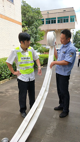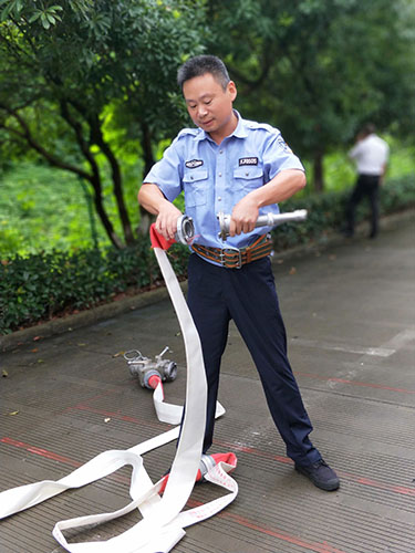 圖為主講人馮常敏操作示范現場 現場,“馮大師”腳下放著兩盤水帶,站姿已成“丁”字步,雙腿微曲,兩拇指與食指握住水帶根部,使虎口以順時針方向對準接口處,做好甩開的準備?!八Φ谝槐P水帶,要運用手腕的力量,要提起水帶并高于地面20到30厘米,再用大臂帶動小臂的力量向前甩出?!?“馮大師”耐心地指導。 接下來是兩盤水帶連接的關鍵時候,“馮大師”左右手熟練操作,將如何連接的操作細節一一展現出來,同時邊操作邊說明注意事項,整套動作連貫又迅速,操作一氣呵成,一旁的新人仔細觀摩學習。