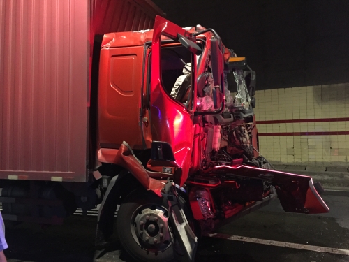 圖為事故車輛 接警后,執(zhí)勤隊員立即奔赴現場,做好車輛預警工作?,F場兩輛廂式貨車停在慢車道上,后貨車的副駕駛室被擠壓得嚴重變形,幸好副駕駛位置無人,否則后果不堪設想。受傷的司機坐在電纜溝上,右手臂一直流血,意識清醒。見司機受傷,隊長通知中控員撥打救護車。前車已經停在電纜溝上,但是車輛不能移動,隊員們向司機詢問之后才了解,前車漏機油,兩車都需要拖車。隊員們一邊在隧道內疏通交通一邊在等候救護車和拖車,16:26分,救護車到達現場將受傷司機帶走,17:50分,拖車將兩輛事故貨車拖離,現場恢復通車。該起事故造成隧道內車輛緩行兩個小時,期間封道十多分鐘,事故原因是前車有故障緩慢行駛,因無任何警示標志,后車沒有注意而造成追尾。 在此提醒各位司機朋友,由于隧道內外亮度不同,進入隧道請?zhí)崆伴_燈減速慢行,在行車過程中要注意前面路況,發(fā)現有問題及時減速慢行,并保持安全車距。如遇突發(fā)狀況,車子無法正常行駛時,為了自已和他人的安全,請及時報警并做好相應警示標志,防止二次事故的發(fā)生。 陳旦平
