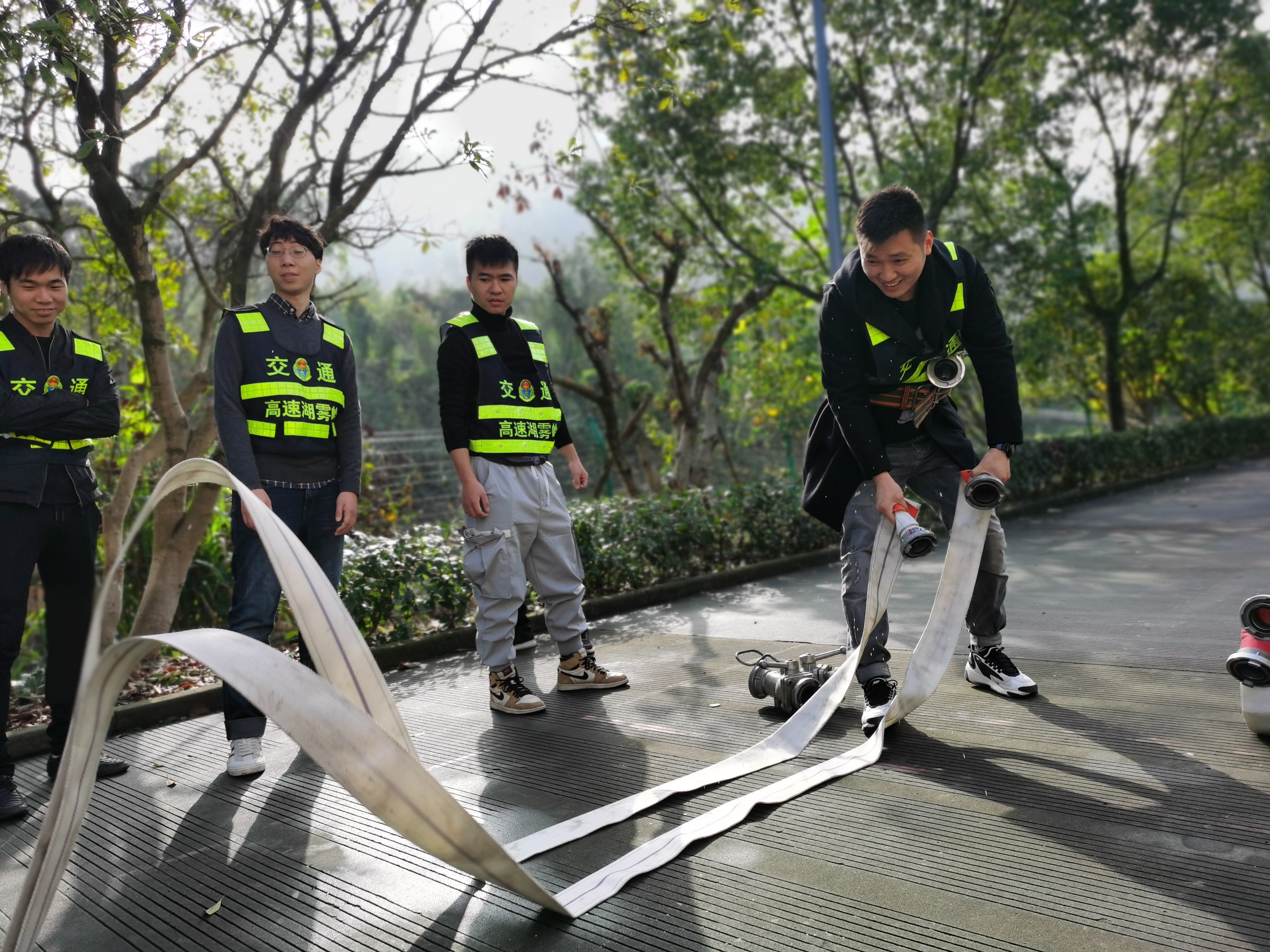 圖為樂清公司員工在水帶操作演練 大溪嶺隧道所執勤隊就是應急救援小分隊,隊員們除了日常工作以外需要進行不斷培訓、演練,只有練就過硬的技能,才能嫻熟地進行救援,確保大溪嶺-湖霧嶺隧道的平安暢通。 陳智慧