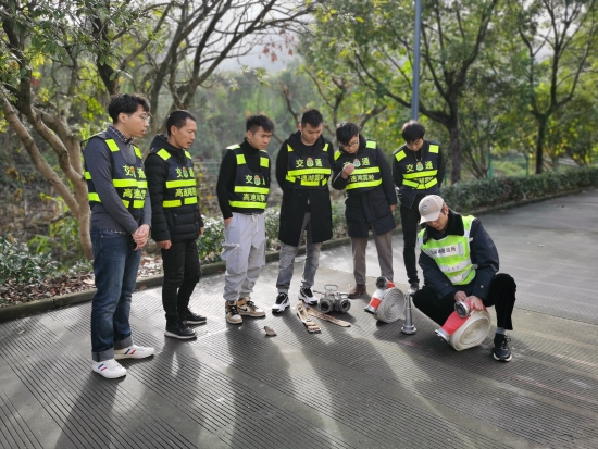 圖為陶文輝在教樂清公司員工如何進行水帶操作 本次培訓對隧道預警流程、二帶連接及執勤隊在平時巡邏、預警、處理事故中如何確保自身安全等進行重點講解。執勤隊長帶領隊員們在管理所操場進行模擬主線卡口、事故拋錨車預警封道操作,樂清公司員工觀摩之后也進行實際操作,孫鵬詳細講解擺放隔離錐應注意事項,每一隔離錐的間隔位置、巡邏車后方擺放的安全距離,事故處理之后,收隔離錐應注意的安全動作。陶文輝為樂清公司員工演示“二帶連接”,并對水帶的甩、接、收每一動作盡可能詳細仔細地進行解說示范。