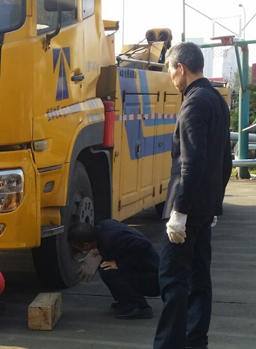 圖為維修現場 救援車輛停在了半路,變成了被救援的車輛,然而施救中心其他的救援車全部行進在路上,一直到下午五點,終于等到姍姍來遲的救援車將已經動彈不得的這輛救援車拖回臺州收費所。經檢查,居然是離合器片損壞,這幾天由于工作量大,施救車輛超負荷運轉,離合器片也超常運作,加劇了磨損,導致離合器片消耗殆盡。
