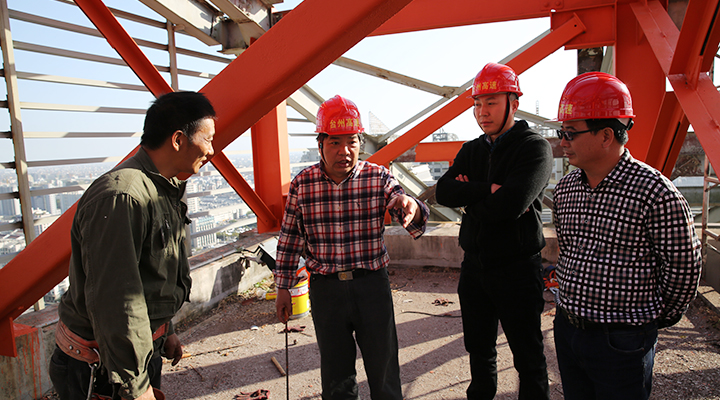 集團安全總監項同富檢查天和大廈除銹施工 11月15日下午,集團安全總監項同富在辦公室、房產公司相關人員的陪同下,到天和大廈樓頂鋼架除銹施工現場檢查施工進展和安全工作。 集團總部天和大廈樓頂鋼架跨度大,高低水平不一致,很難搭建大范圍的防護網及腳手架等施工輔助工具,也無法采用大型機械打磨除銹的方式除去表面的銹層,只能靠手工和電動角磨機除銹。施工人員常常進行高空作業,安全隱患大。