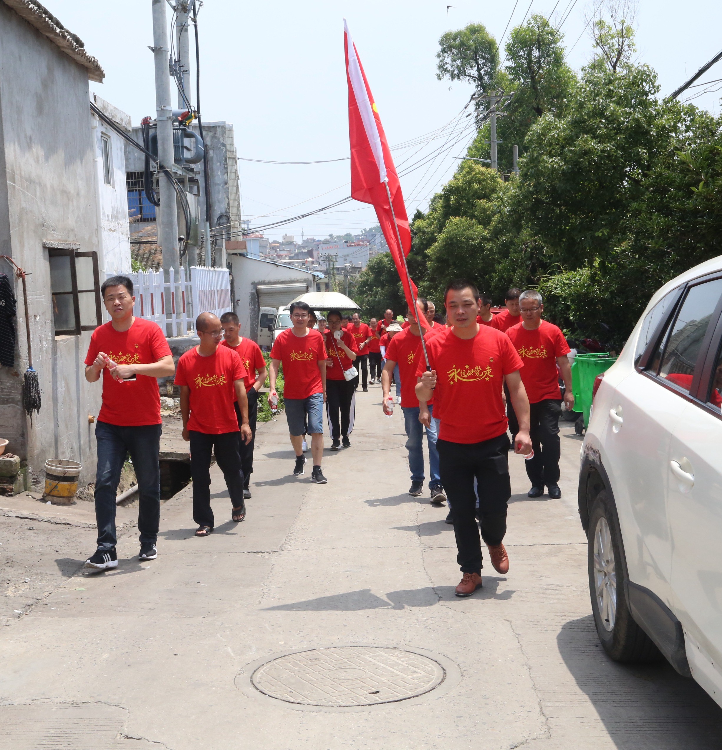 活動當(dāng)天,烈日炎炎抵擋不住大家追溯紅色基地的熱情,黨員隊伍緊跟黨旗,順著“紅色地圖”,沿著崎嶇小道,大步爬上玉環(huán)坎門英雄基干民兵營。在女民兵們的熱心引導(dǎo)和生動解說下,大家側(cè)耳傾聽,目不轉(zhuǎn)睛地觀看展示墻上與玻璃柜中的民兵隊歷史事跡照片、繳獲的槍支、文件與榮譽(yù)獎?wù)碌鹊龋癍h(huán)坎門人民的紅色抗?fàn)帤v史仿佛仍歷歷在目,打動著每位黨員的內(nèi)心。隨后,大家在黨旗前光榮宣誓,重溫入黨誓詞,各位黨員緊握右拳,用洪亮的聲音表達(dá)著自己對黨的忠誠,對初心使命的矢志不渝。