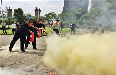 “趕快救火!”隨著教官一聲令響,比武正式開始。“消防員”們個個行動神速,鎮定地手持滅火器,拔掉保險銷,對準著火點壓下手把噴射,動作連貫一氣呵成。