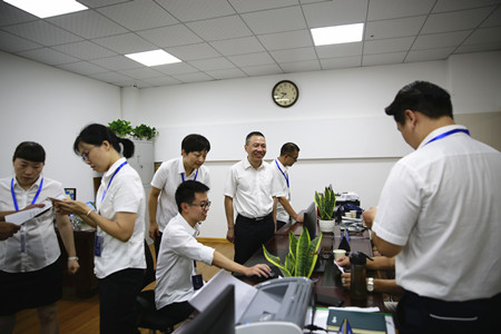 圖為集團副董事長、總經理張建平在臨海股權收購點檢查工作人員業務操作