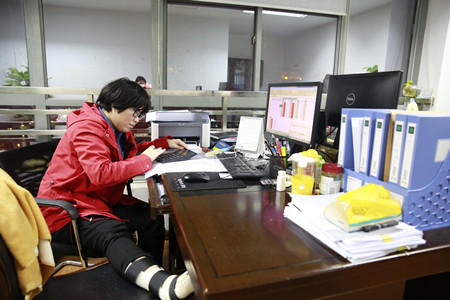 圖為股權投資部李茜茜帶傷工作現場 “每天,我們會第一時間審核各收購點上報的資料,如果發現股東身份證、銀行賬號等信息不準確,我會及時聯系收購點?!必撠煿蓹嗍召徍笈_數據匹配處理、收購款匯總、股權過戶等工作的李茜茜,對待每個環節都十分細致認真,為確保各類數據準確無誤,她都要經過多番核對,當確定下收購款匯總表時,便及時與財務結算中心對接,不讓任何一環掉鏈子。 10月21日,腳不慎扭傷而無法行走的李茜茜,考慮到股權收購正處于緊要關頭,工作量大,數據處理復雜,人手緊缺等各方因素,她放心不下,堅持帶傷上崗,并主動要求家人到單位照顧日常生活,集團辦公室專門調出休息室供其臨時使用。 “我們很理解支持女兒的工作,也很感謝臺州高速對我們的關懷,希望她盡心盡力做好工作?!崩钴畿绺改缸灾琅畠菏軅翘炱穑惴畔率种惺拢瑢iT從溫嶺趕來讓女兒安心工作,一家三口助力完成股權收購工作。 據股權投資部副經理楊靜介紹,李茜茜在股權投資部已有兩年,還有股權代理點一線業務經驗,平日好學的她,無論是在業務專業知識還是數據軟件處理上,都非常嫻熟,在這樣的收購關鍵時期,其他人員無法有效代替她的工作。 自集團股權收購工作開展以來,收購一線繁忙的景象每日在“股權收購點工作小組”微信群里呈現,幕后的工作人員也常常加班加點,幾乎沒有正常的上下班時間,受傷的李茜茜同其他人一樣毫無怨言,每日堅持完成各項工作,大家團結一致,確保股權收購順利推進。 陳林偉