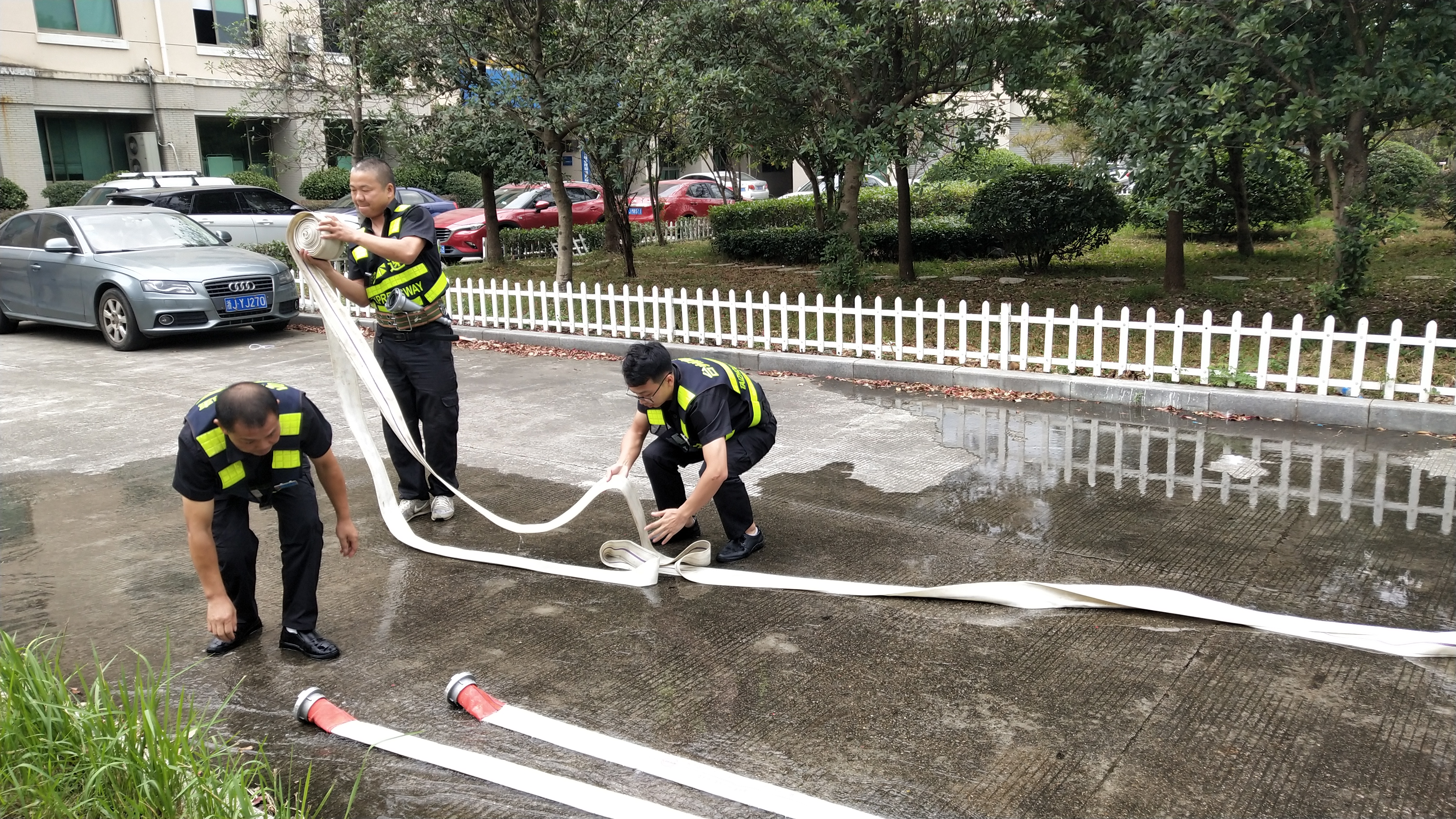 圖為演練現場 此次演練的虛擬情境為隧道內發生車輛起火事件并造成路產損失而開展的救援處置。施救中心在接到指令后,兩人一組,分成兩組,分別駕駛施救車輛和勘查車輛出警奔赴事故現場。 演習過程中,公司安保部對中心人員快速反應、科學處置,及時滅火和現場勘查路產損失等專業能力表示了肯定。