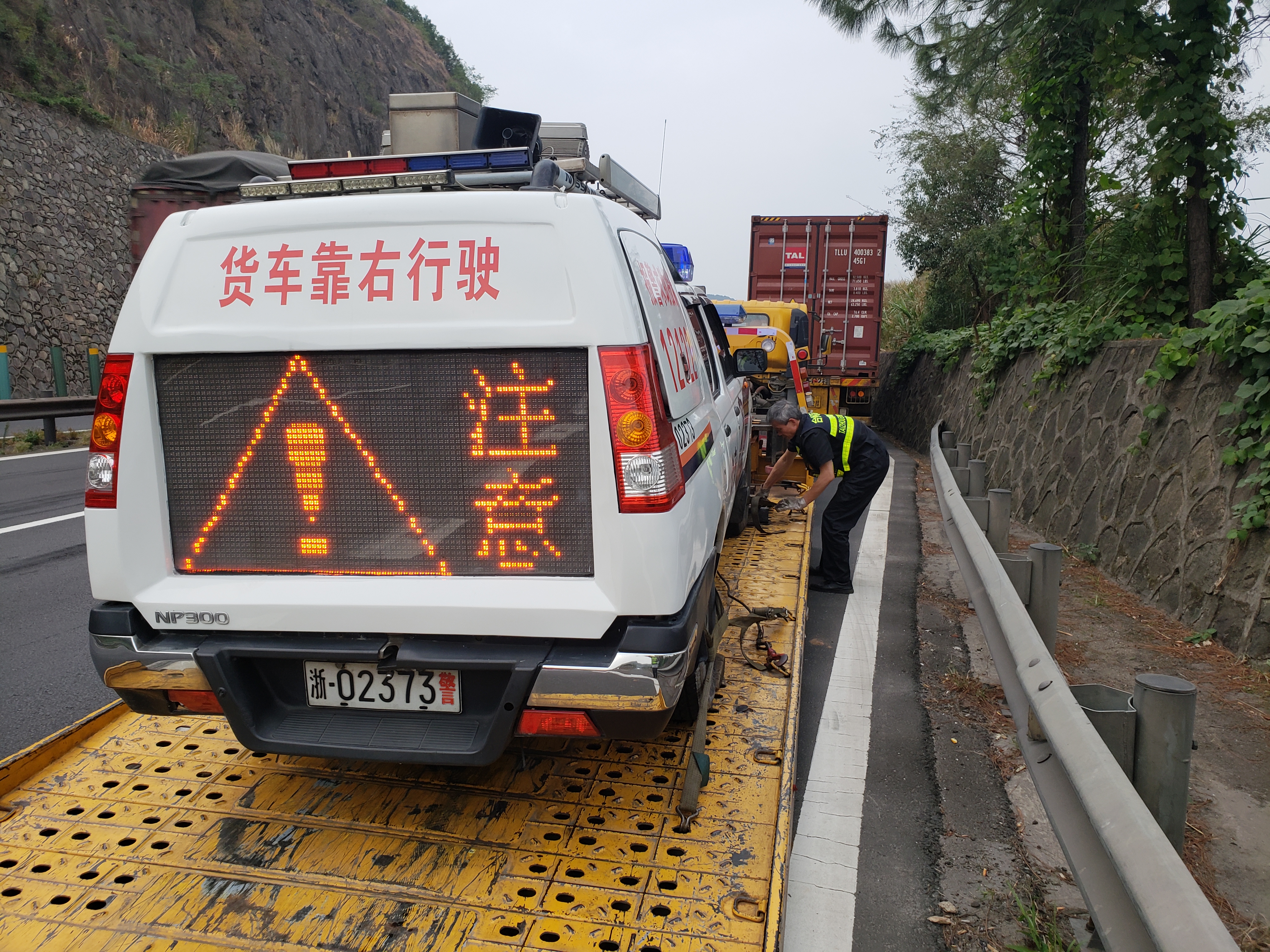 25日上午10點,兩人在處理一輛沒有年檢已經達到報廢標準的小面包車時,接到指揮中心報警,一輛奧迪小轎車拋錨在臺州收費站往臺州南方向出匝道位置的超車道上,需要救援。