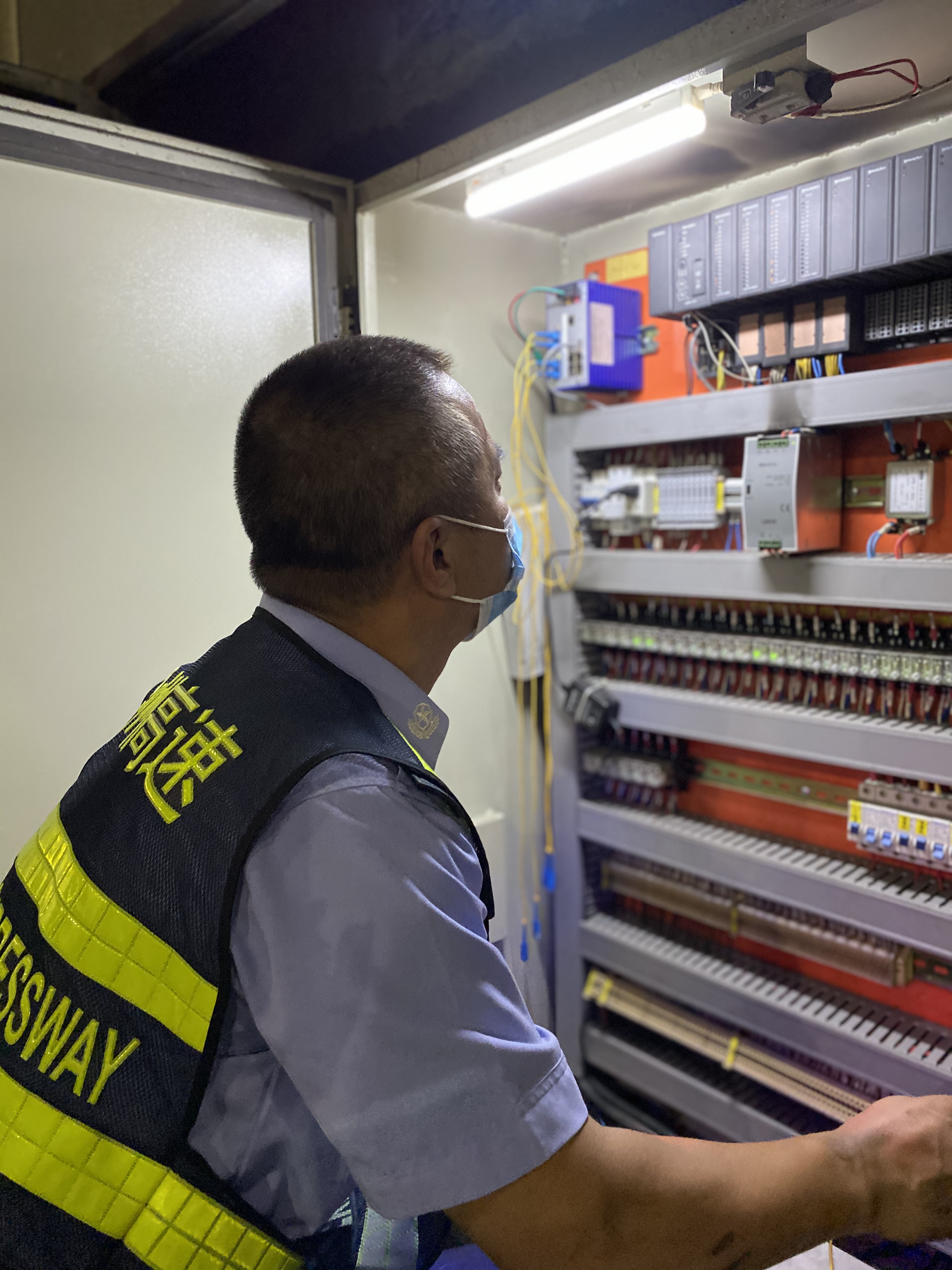 雖然隧道內(nèi)沒有烈日的灼燒,但日均4萬的車流,加上尾氣排放,導(dǎo)致隧道內(nèi)的氣溫遠(yuǎn)高于室外。當(dāng)室外37°C時(shí),整個(gè)隧道里宛如一個(gè)蒸籠。盡管如此,廣場上、電纜溝上隨時(shí)都有執(zhí)勤隊(duì)員忙碌的身影。他們來回徒步穿梭于隧道,檢查指示燈、消防設(shè)備箱、緊急電話、火災(zāi)報(bào)警等設(shè)施設(shè)備,排查各類安全隱患,修復(fù)受損設(shè)備,處理各種突發(fā)情況。一趟下來臉和胳膊被熏得黝黑,口罩、衣服濕了又干、干了又濕,盡管工作量大、強(qiáng)度高,他們從不喊苦說累。