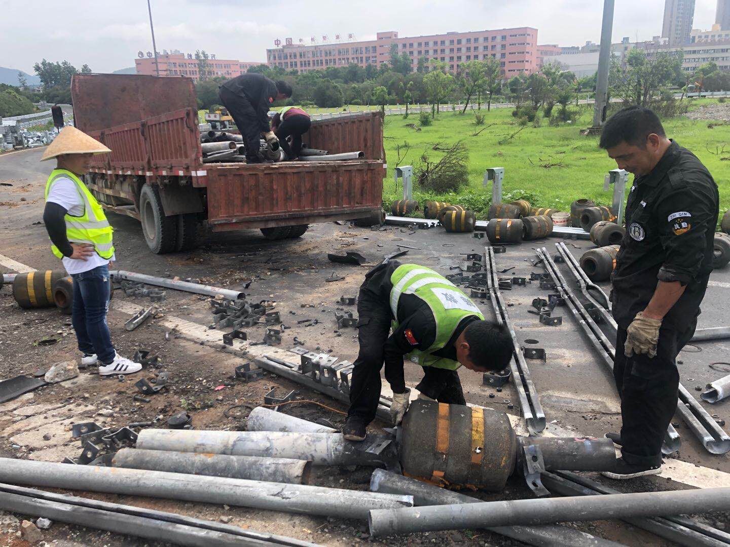 圖為各部門小組人員監(jiān)督現(xiàn)場 此次廢舊物資數(shù)量大,護欄板因高溫沖擊造成了強烈的扭曲變形,這無疑給裝載增加了難度。大家和裝載人員一起想辦法,以便更好地裝車安全抵達(dá)院橋磅秤站。盡管天氣燥熱、環(huán)境嘈雜,可絲毫未影響小組成員的工作熱情,因時間倉促,所有人利用午休時間加快工作進(jìn)度,一直堅守現(xiàn)場。在趁車裝載間隙,兵分兩路,一隊現(xiàn)場盯裝車,另一隊由林軍帶領(lǐng)趕往塘嶺廣場、臺州收費所,對阻塊等廢舊物品進(jìn)行勘察,隨后又馬不停蹄趕往院橋磅秤站匯合監(jiān)督過磅環(huán)節(jié)。 直至下午5點,大家終于結(jié)束工作。據(jù)統(tǒng)計,此次共處理廢棄物資約15噸。 毛譯聆