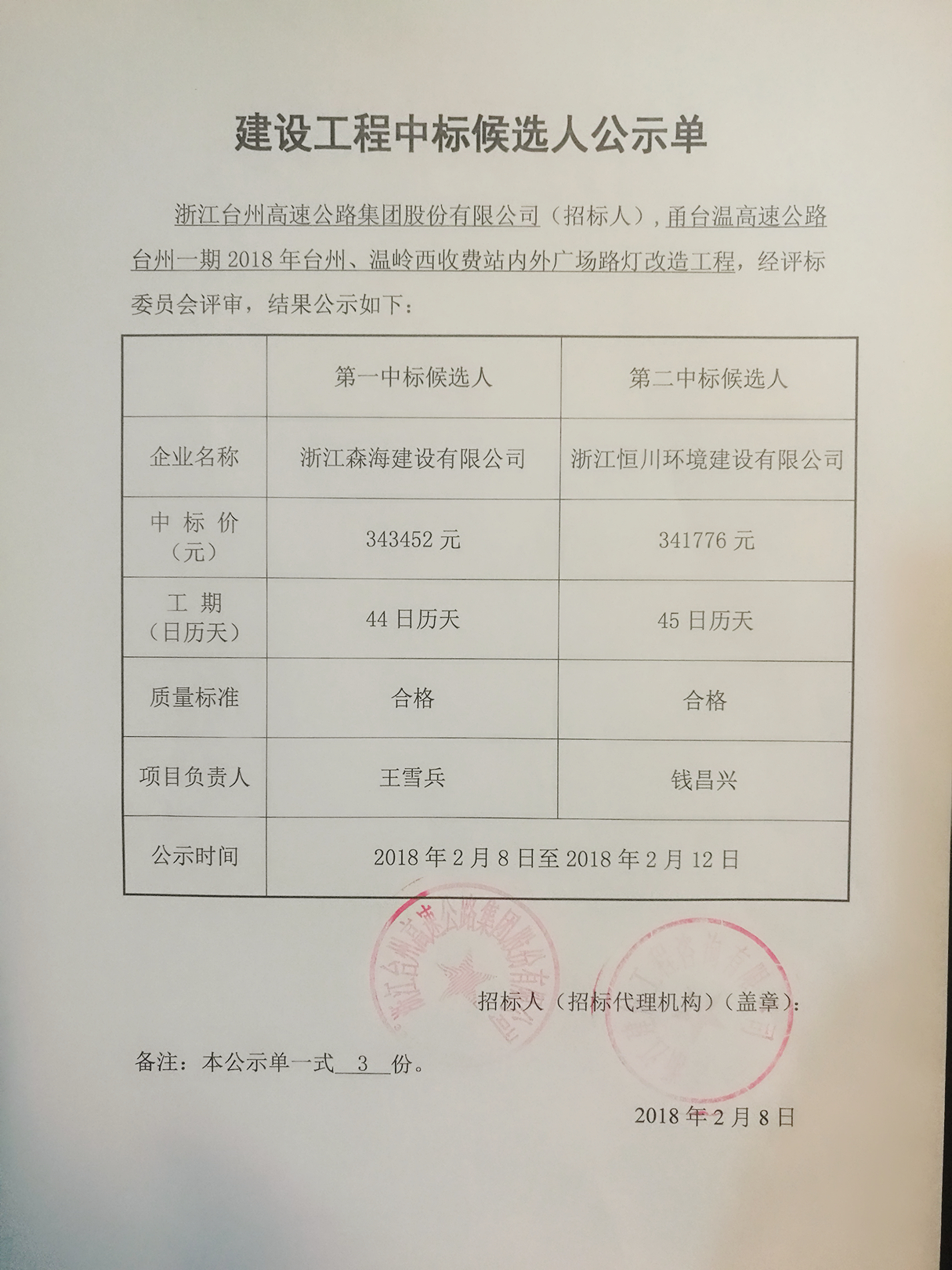 2018年臺(tái)州、溫嶺西收費(fèi)站內(nèi)外廣場(chǎng)路燈改造工程中標(biāo)候選人公示單