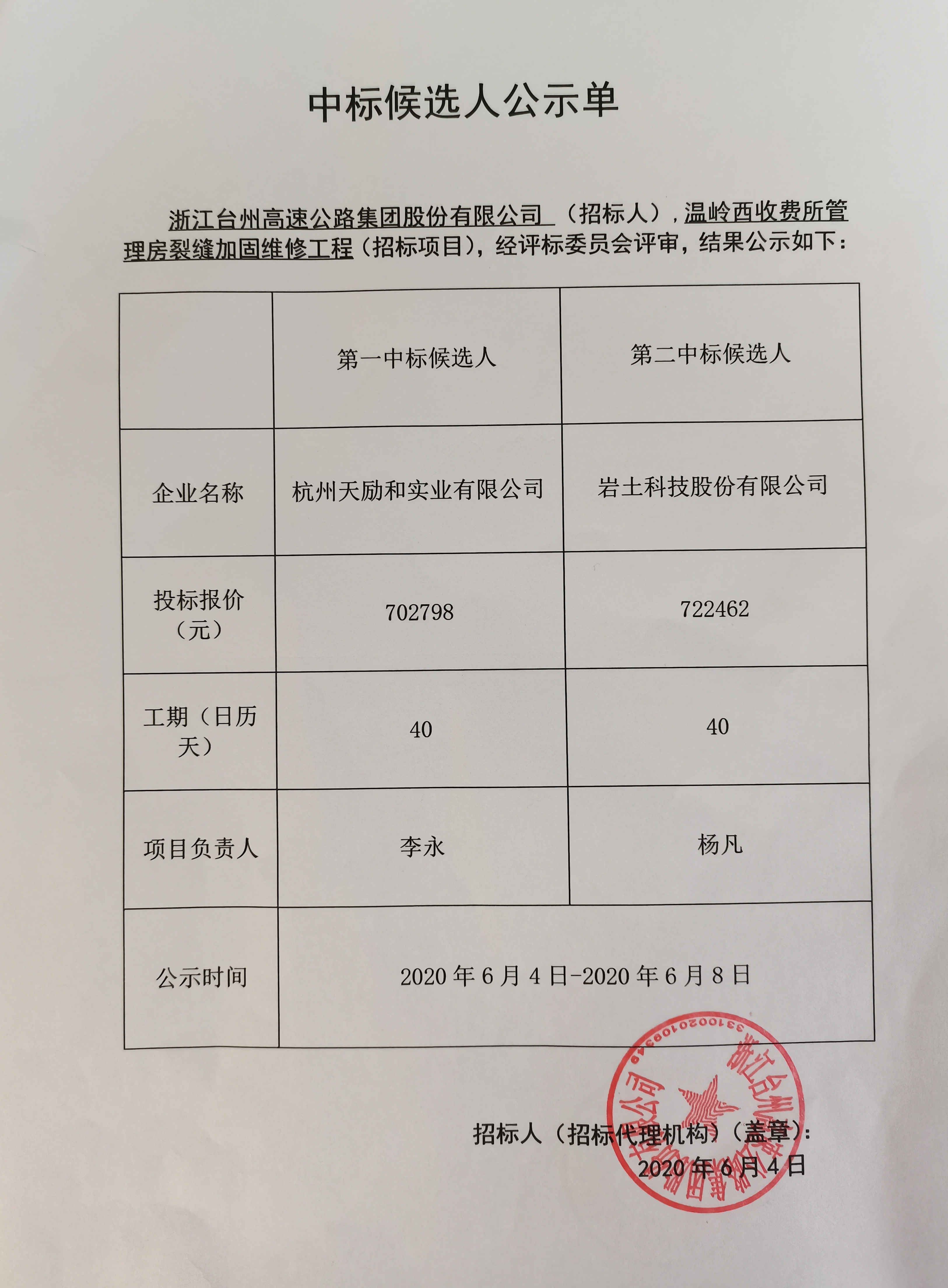 溫嶺西收費所管理房裂縫加固維修工程中標候選人公示單