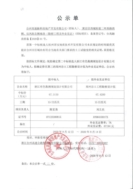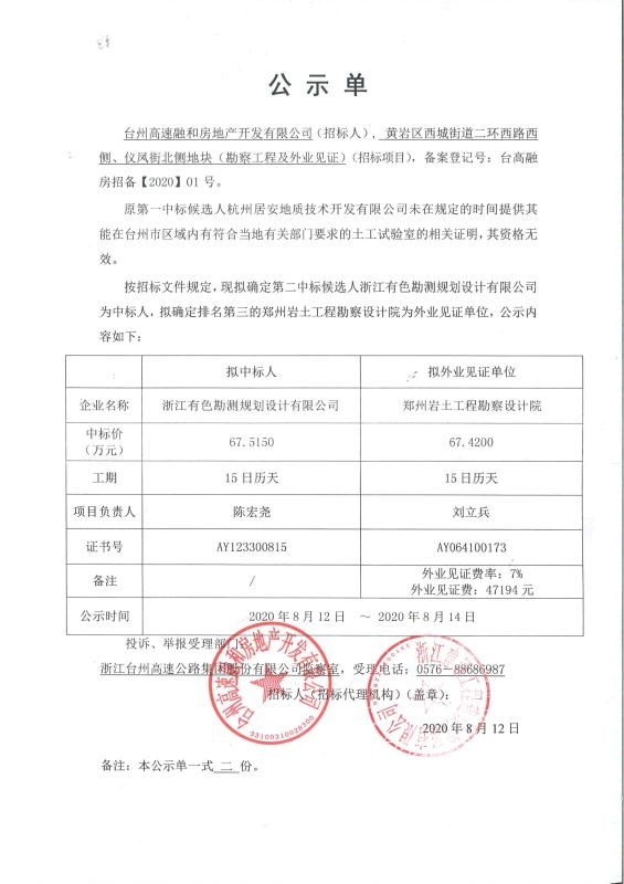 黃巖二環(huán)西路西側(cè)、儀風(fēng)街北側(cè)地塊(勘察工程及外業(yè)見(jiàn)證)中標(biāo)公示