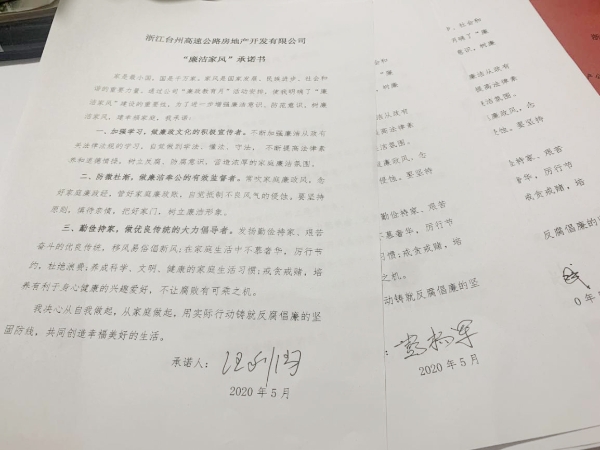 圖為全體黨員觀看廉政教育短視頻《國畫》  圖為簽訂“廉潔家風(fēng)”承諾書 根據(jù)集團公司《關(guān)于組織開展“廉政教育月”活動的通知》文件要求,為推動“不忘初心、牢記使命”主題教育常態(tài)化,深入學(xué)習(xí)貫徹黨的十九大和十九屆二中、三中、四中全會及十九屆中紀(jì)委四次全會精神,嚴(yán)守黨的政治紀(jì)律和政治規(guī)矩,更好地落實黨風(fēng)廉政建設(shè)有關(guān)要求,高速房產(chǎn)公司黨支部組織了這次專題活動。全體參會人員一起觀看廉政教育視頻,宣讀“廉潔家風(fēng)”倡議書,簽訂“廉潔家風(fēng)”承諾書,開展“廉潔文明家風(fēng),黨員干部示范”大討論。 此次黨風(fēng)廉政專題活動進(jìn)一步增強了黨員干部的廉潔意識、防范意識,起到帶頭正品行、立家規(guī)、嚴(yán)家教、樹家風(fēng)建設(shè)的表率作用,以好家風(fēng)促黨風(fēng)帶社風(fēng)民風(fēng),為新形勢下臺州高速房產(chǎn)事業(yè)貢獻(xiàn)力量。 鄭攀