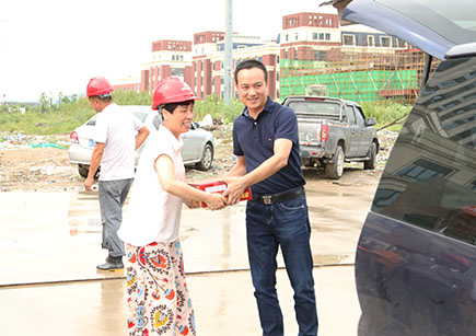 圖為仁和房產董事長羅小將向施工單位代表遞送慰問品