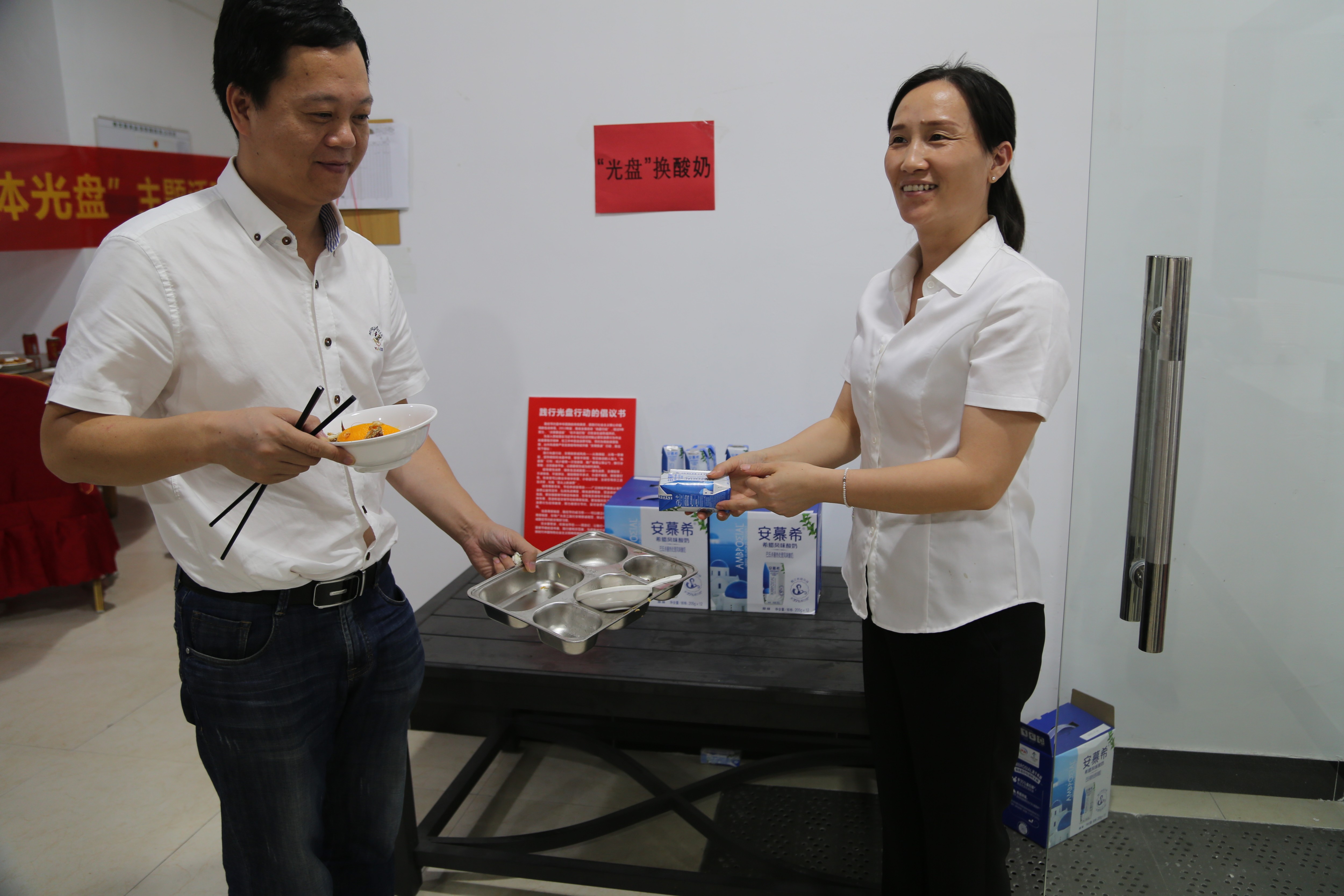 餐后,公司為倡導員工愛惜糧食,鼓勵員工積極光盤,實行“光盤獎勵”,每一位員工憑光盤可以兌換酸奶一瓶,借此小獎勵,倡導文明新風尚,以“光盤”為榮,以“剩宴”為恥。 盧丹麗