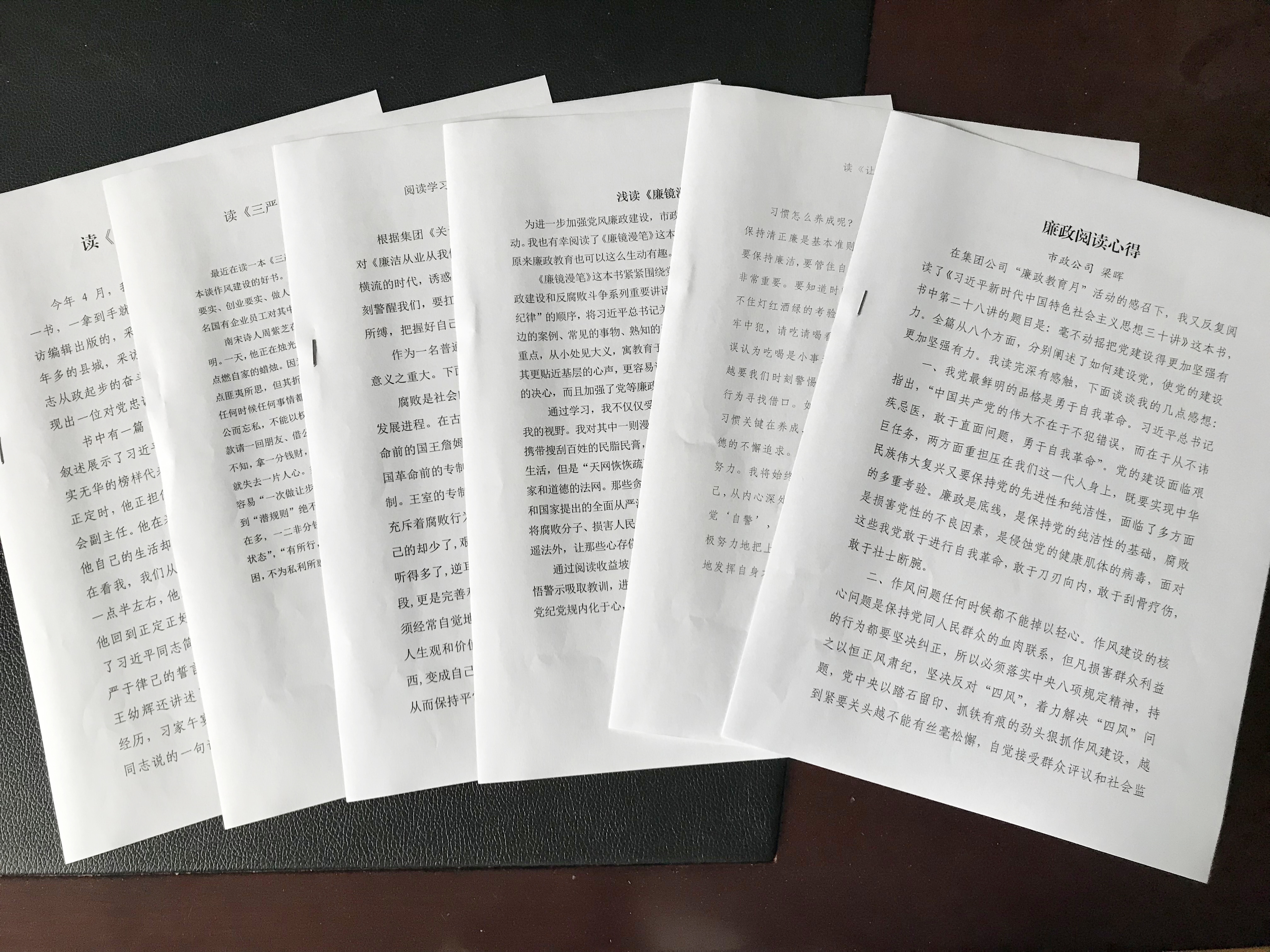 圖為集中學習現場 每月月度例會上,市政公司組織員工有針對性地學習集團和市政公司的制度與流程。該公司制作了一本制度匯編,并分發到人手一本,要求員工認真學習,熟悉公司辦事流程和規章,工作中做到照章辦事,增強員工的制度觀念。 5月月初,市政公司組織開展讀書思廉活動,要求每位員工讀一本勤政廉政書籍,并撰寫一篇讀書心得。從一篇篇心得體會文章中,看到有從歷史廉政小故事切入的,也有從習近平總書記的新時代中國特色社會主義思想和十九大報告中領悟道理的,字字流露了真情實感,句句體現出真切感悟,真正做到了學有所悟,營造了良好的學廉思廉的氛圍。